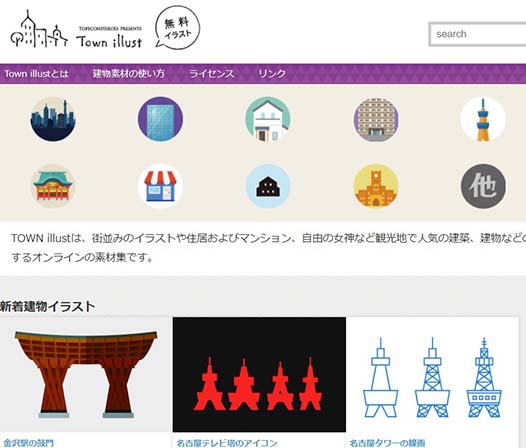 TOWN illustは、街並みのイラストや住居およびマンション、自由の女神など観光地で人気の建築、建物などのイラストを無料で配布するオンラインの素材集。