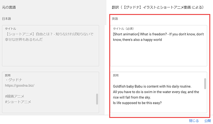 英文入力が完了したら、右下の『公開』ボタンを押すと、動画の英語化が完了です。